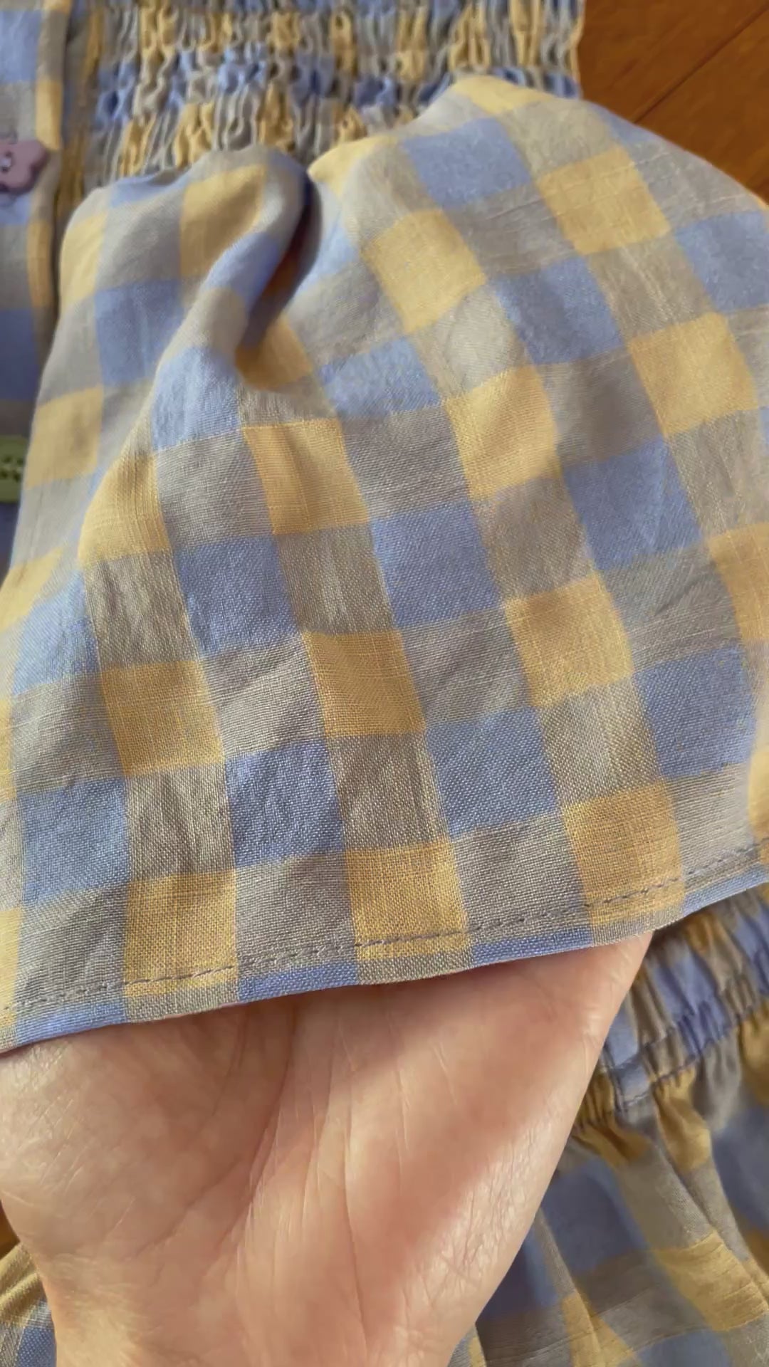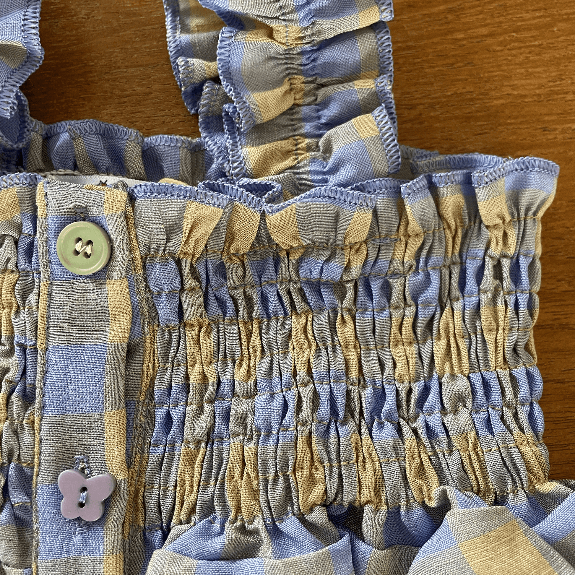 Our Picnic Pop 🍋💜 set is a playful two-piece featuring a shirred cotton top with ruffled straps and matching bloomer shorts, both in a soft lavender and gold tone gingham check. Made for sunny day exploring, chubby-legged toddles, and lazy lunches on picnic blankets.