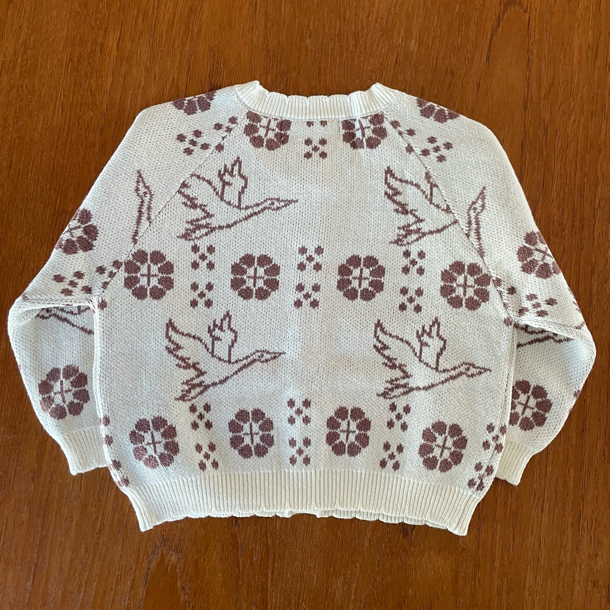 This cosy knit features an all-over jacquard pattern of graceful crane birds in flight—symbols of peace, longevity, and good fortune in many cultures. Designed with an oversized, relaxed fit that layers easily through the season and pairs with everything.