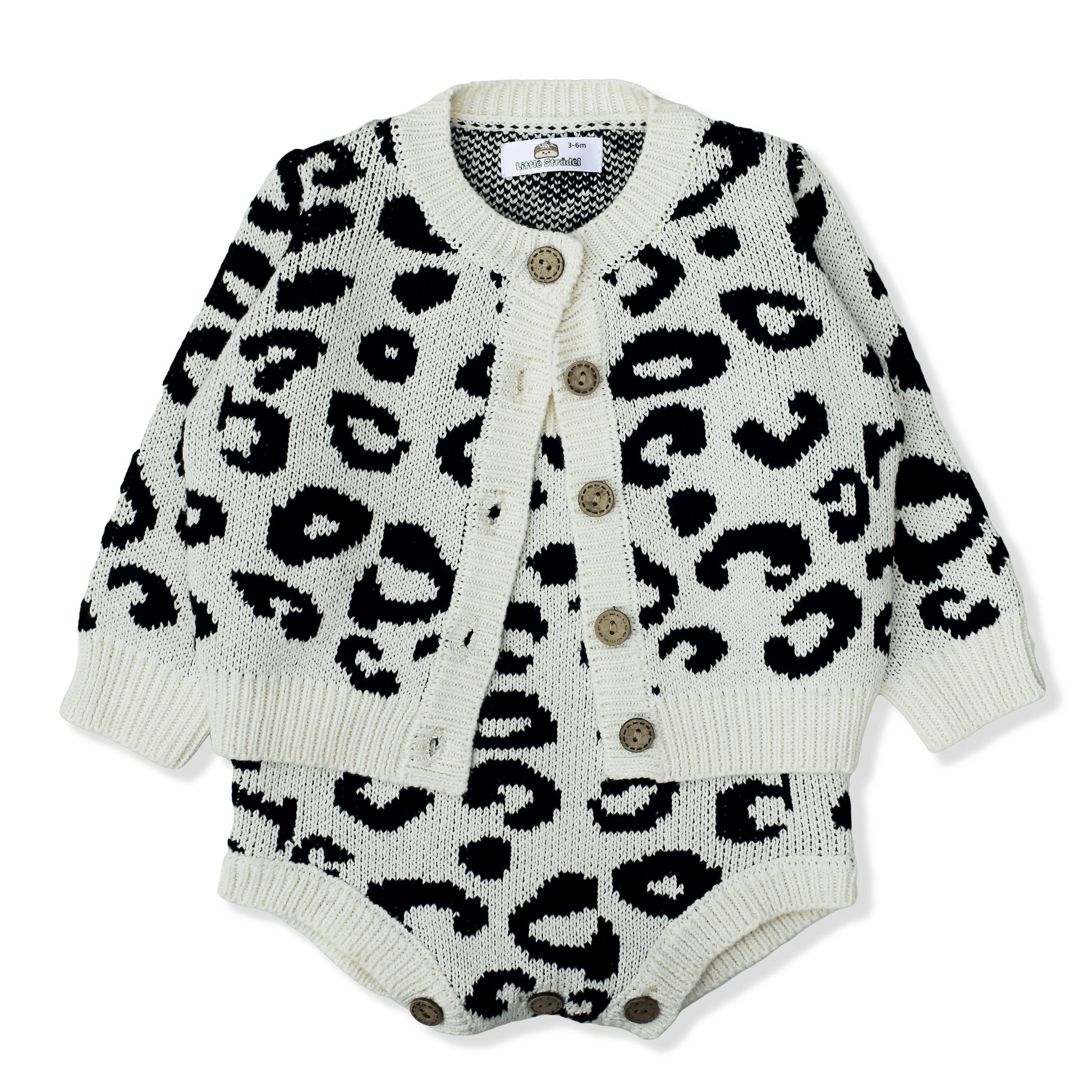 Snuggle up in this super soft leopard baby knit cardigan and romper set.